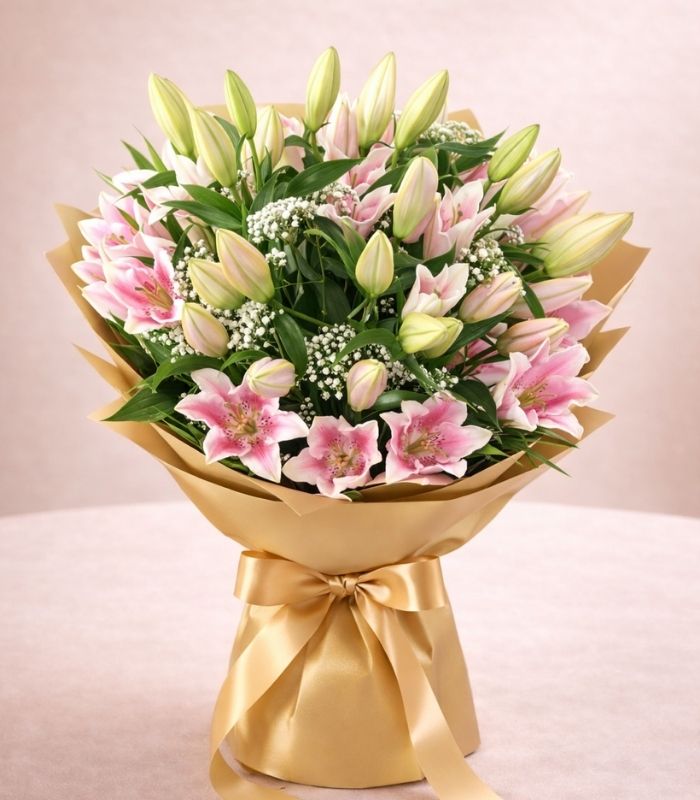 A breathtaking bouquet of fresh pink lilies in mixed bloom and bud stages, beautifully wrapped in premium golden paper and finished with a luxurious satin ribbon. Accented with delicate baby’s breath and rich green foliage, this arrangement creates a soft, graceful, and premium look perfect for heartfelt gifting.