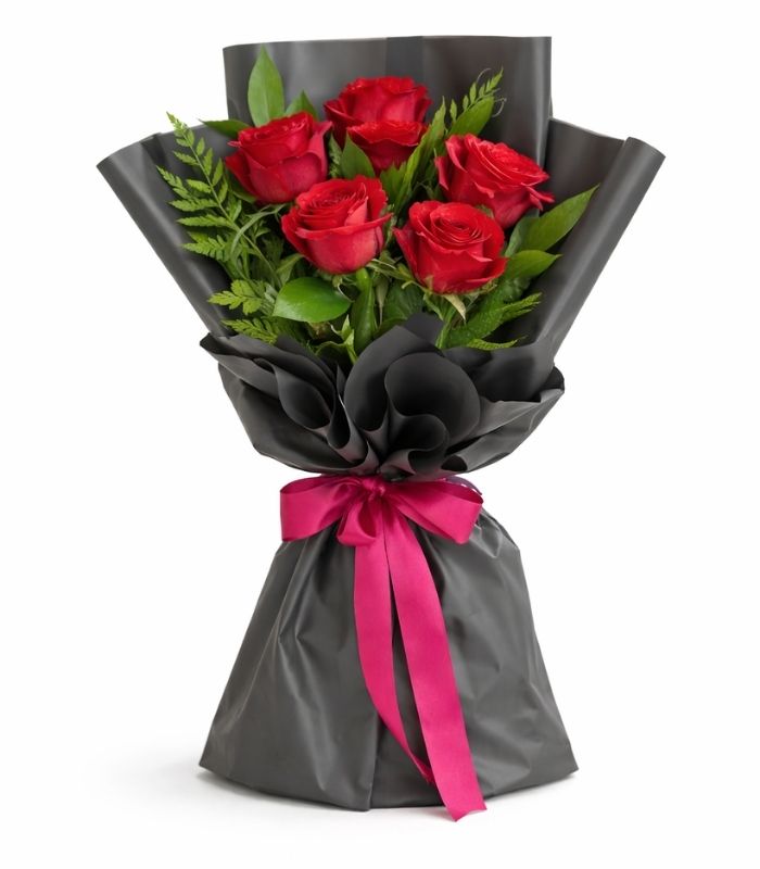 Bring timeless beauty and heartfelt emotion with our Classic Red Rose Elegance Bouquet, expertly arranged with fresh red roses and lush green fillers. Wrapped in premium black wrapping paper and finished with a rich ribbon tie, this bouquet offers a modern yet romantic look suitable for any occasion.